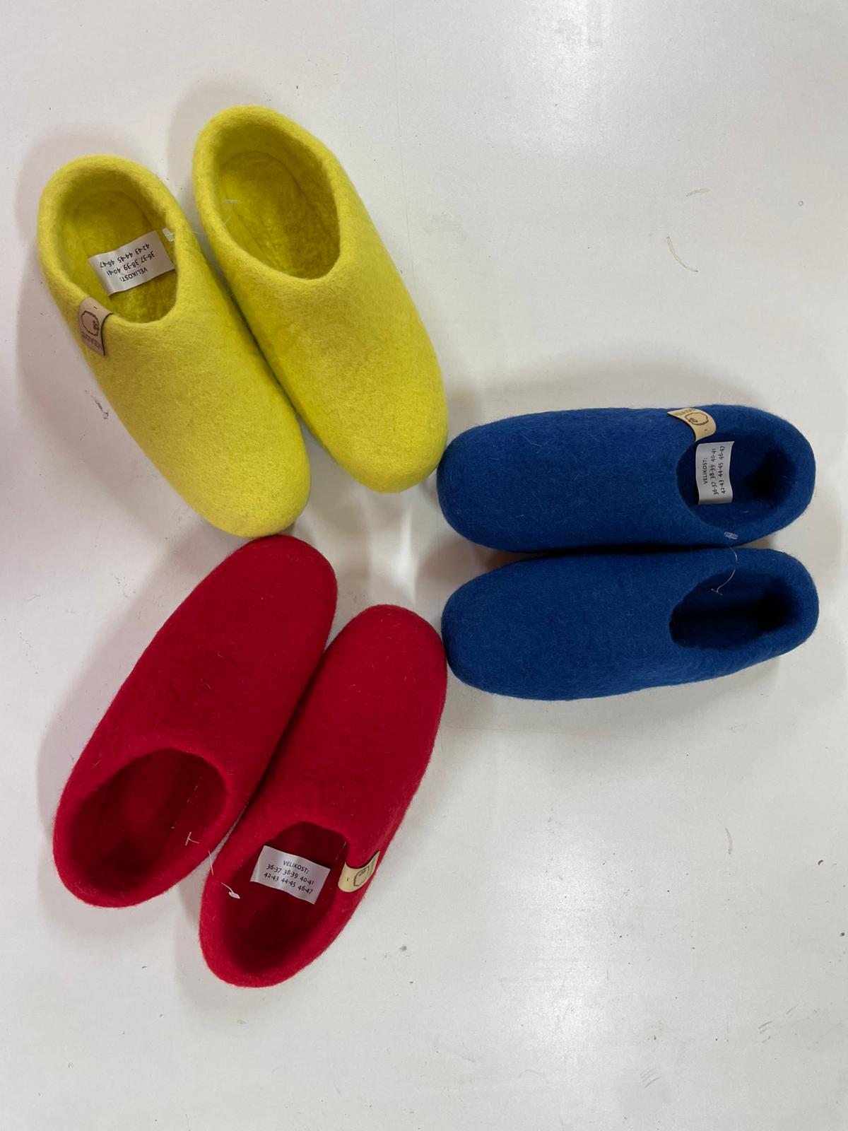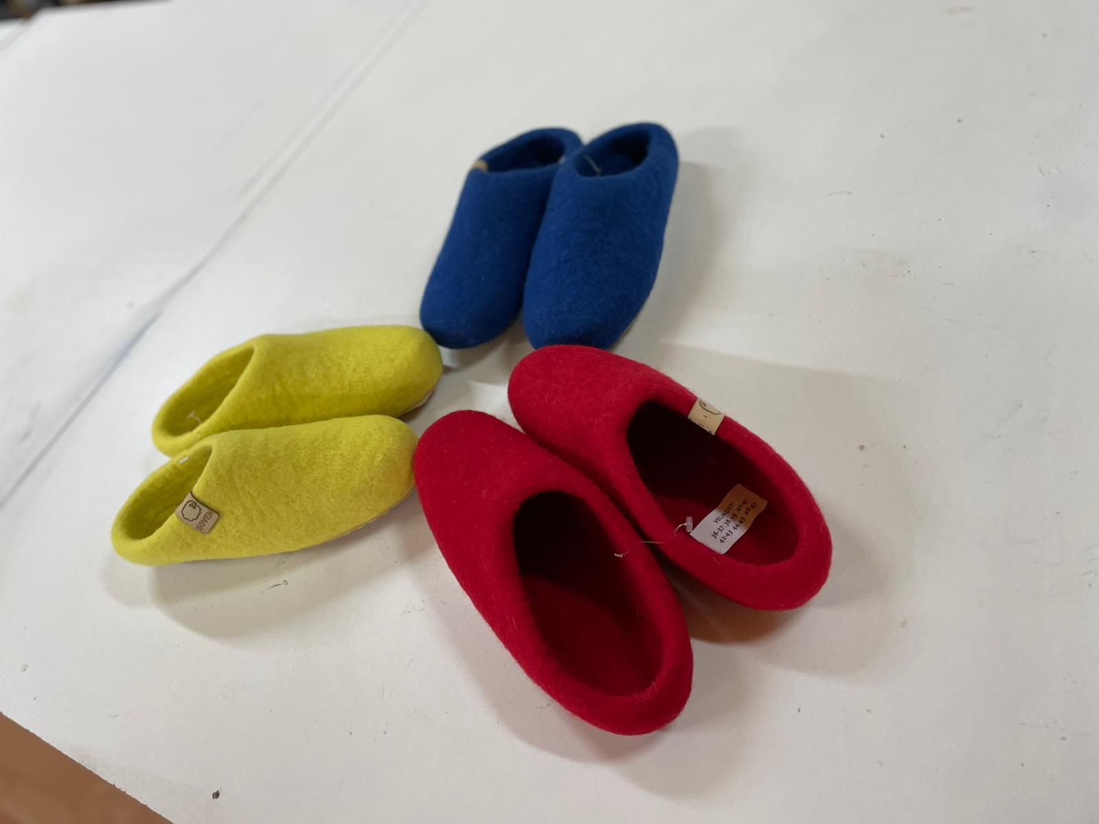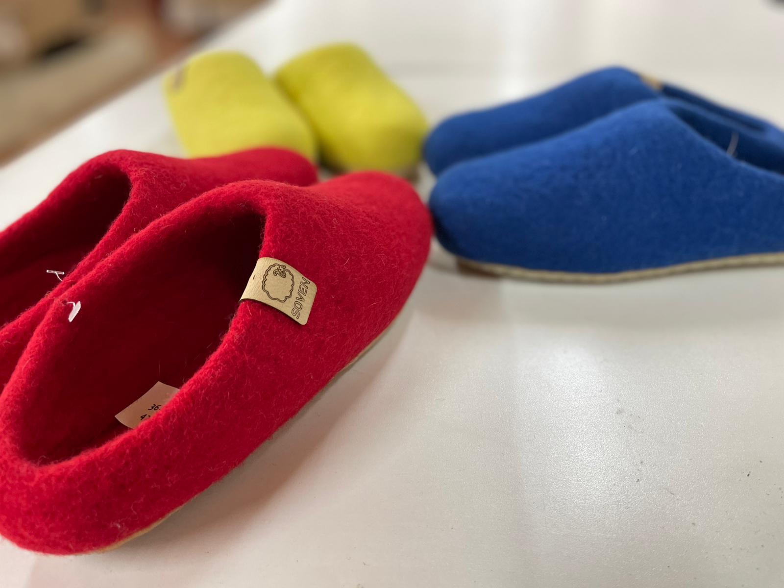 MATERIAL IN NAČIN IZDELAVE:  narejeni so iz 100 % naravne, slovenske ovčje volne. So ročno polsteni. Polstenje je  osnovna in najstarejša oblika izdelave volnenega blaga. Na podplatu imajo  gumijast podplat, ki ne drsi.